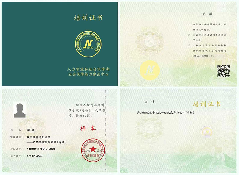 产品经理数字技能-AI赋能产品设计证书是相关从业人员可以重点学习和考取的证书,该证书表明持有者已经通过相关课程的培训和考核,具备相关的专业知识和职业技能,是岗前培训、在职培训、职业技能提升培训、创业培训的证明,是劳动者任职、上岗的参考依据之一。 证书编号为唯一编码,证书有效性可通过发证单位官方指定的官网查询。